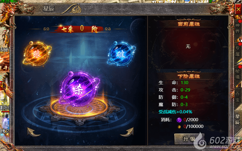 1、消耗精魄可以升级星辰系统,升级后会获得大量属性;